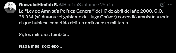 «La ‘Ley de Amnistía Política General’ del 17 de abril del año 2000, G.O. 36.934 (sí, durante el gobierno de Hugo Chávez) concedió amnistía a todo el que hubiese cometido delitos ordinarios o militares. Sí, los militares también. Nada más, sólo eso…», sentenció Himiob.