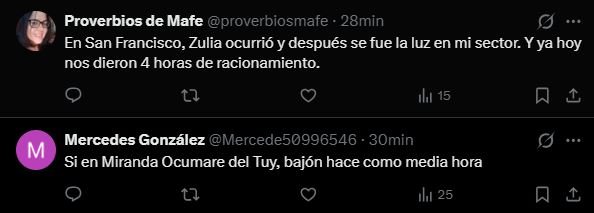 - Zulia: En San Francisco, los usuarios reportaron que tras el «bajón», algunos sectores quedaron sin suministro y denunciaron hasta 4 horas de racionamiento previo.