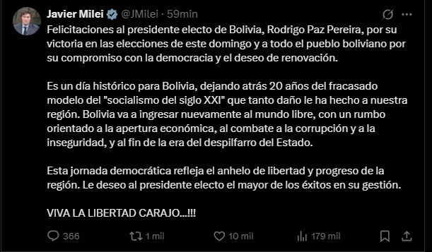 En su publicación, Milei aseguró que Bolivia “deja atrás 20 años del fracasado modelo del socialismo del siglo XXI”, al que responsabilizó de causar daños económicos y políticos en América Latina.