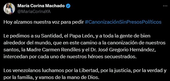 «Hoy alzamos nuestra voz para pedir una canonización sin presos políticos. Le pedimos a su santidad, el papa León, y a toda la gente de bien alrededor del mundo que en este camino a la canonización de nuestros santos, la madre Carmen Rendiles y el Dr. José Gregorio Hernández, intercedan por cada uno de nuestros héroes secuestrados», expresó en la red social X.
