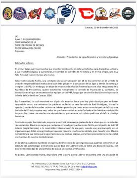 En una comunicación oficial revelada como primicia por El Extrabase, el presidente de la Liga Venezolana de Béisbol Profesional (LVBP), Giuseppe Palmisano, envió una dura carta al Comisionado de la Confederación de Béisbol Profesional del Caribe (CBPC), Juan Francisco Puello Herrera. La misiva, fechada el 25 de diciembre, responde a la decisión de retirar a Caracas la sede de la Serie del Caribe 2026 para trasladarla a Guadalajara, luego de que las ligas de República Dominicana, México y Puerto Rico decidieran no viajar a Venezuela.