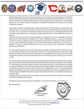 En el documento, Palmisano transmitió «el sentido de frustración y, asimismo, de desolación en el que se encuentran los equipos de la LVBP» tras la medida que los dejó sin el evento. El dirigente criticó la falta de debate profundo sobre los pros y contras antes de tomar la «frustrante decisión del 15 del presente mes», argumentando que se debió evaluar con mayor detenimiento el daño causado a una «liga hermana».