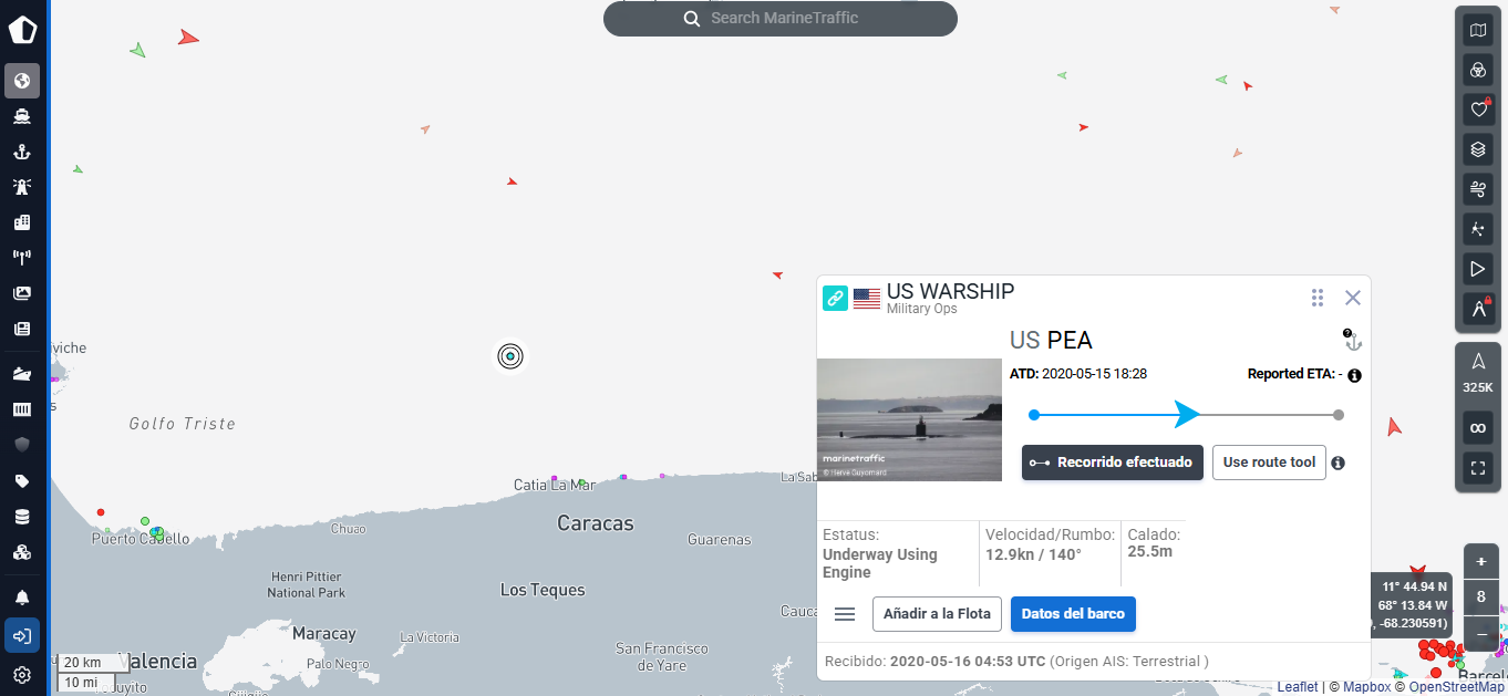 Sistemas de rastreo de tráfico marítimo registraron la presencia del submarino USS Texas, adscrito a la Armada de los Estados Unidos, a 17 millas náuticas al norte de Catia La Mar.